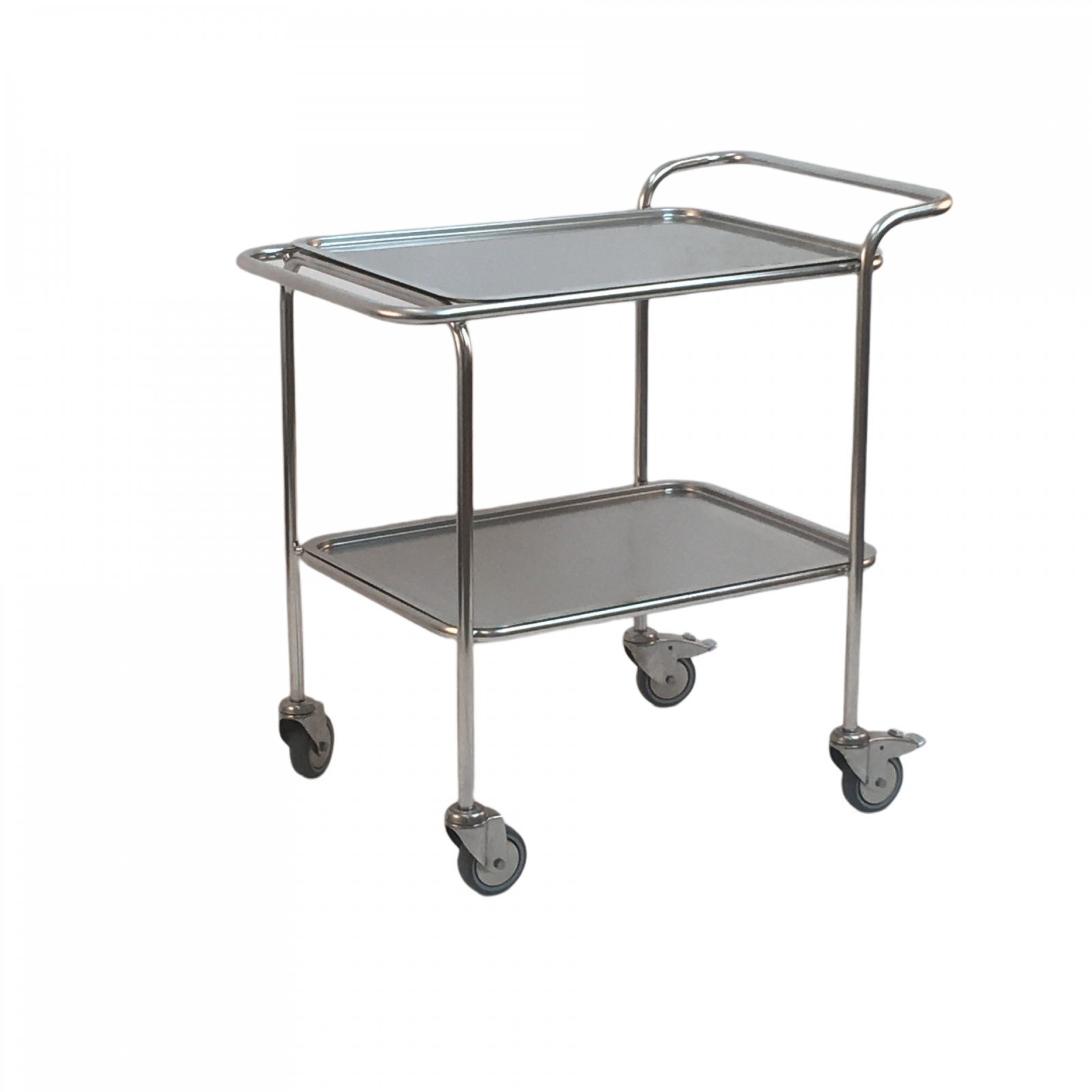Dvě patra vozíku jsou tvořena nerezovými tácy s prolisem o rozměru dxšxhl=64x34x1,5cm.